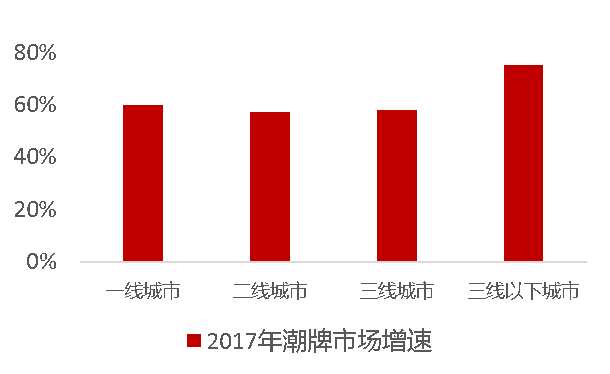 (2)從潮牌服裝市場消費(fèi)城市規(guī)模來看,消費(fèi)一二線城市引領(lǐng)消費(fèi),三線以下城市增速強(qiáng)勁。一二線城市消費(fèi)基礎(chǔ)好,潮牌消費(fèi)額處于全國領(lǐng)先的高度,增速相對穩(wěn)定。而對于三線及以下城市雖然消費(fèi)額較低,但增幅卻高于一線城市。
