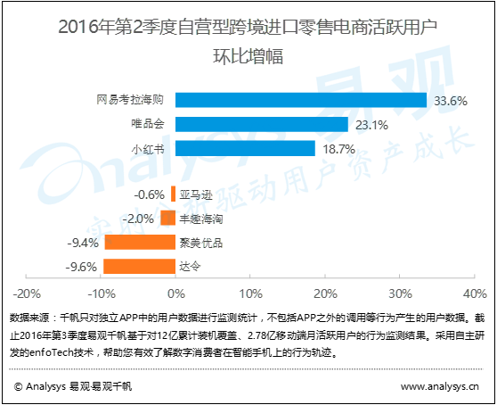 自營型跨境進口零售電商中,承載其業(yè)務APP的活躍用戶表現(xiàn)出了較明顯的差距:網(wǎng)易考拉海購以33.6%的增長態(tài)勢處于第一,其在郵箱、新聞、音樂、游戲等領域的用戶協(xié)同效應逐漸被釋放出來。唯品會與小紅書差距不大,分列以23.1%和18.7%居于第二、第三位,其余的主要廠商,第2季度的活躍用戶環(huán)比都為負增長。