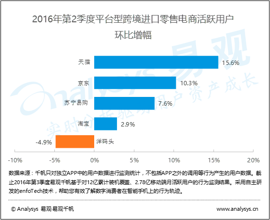 平臺型跨境進口零售電商中,承載其業(yè)務APP的活躍用戶表現(xiàn)出了一定的差異:天貓和京東相對較高,分別為15.6%與10.3%;淘寶的活躍用戶增長較低,只有2.9%;蘇寧易購介于二者之間,為7.6%;而洋碼頭則出現(xiàn)了負增長,為-4.9%。這表現(xiàn)出了用戶的選擇偏好有朝B2C模式的平臺型電商集中的趨勢。