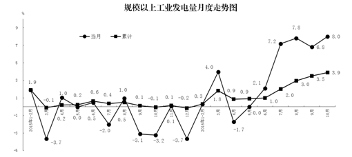 10月份,規(guī)模以上工業(yè)發(fā)電量同比增長(zhǎng)8.0%,增速比上月加快1.2個(gè)百分點(diǎn)。1-10月份,規(guī)模以上工業(yè)發(fā)電量同比增長(zhǎng)3.9%,比上年同期加快4.0個(gè)百分點(diǎn)。