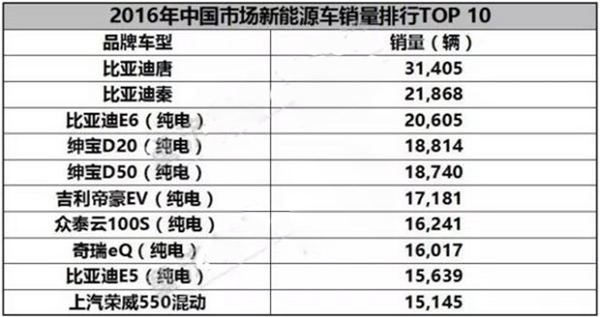 聊完美國市場,我們再把視線轉(zhuǎn)移到中國國內(nèi)市場。從乘聯(lián)會發(fā)布的2016年新能源汽車銷量數(shù)據(jù)來看(進(jìn)口車型沒有計入其中),比亞迪包攬前三甲,銷量均在2萬輛以上,比亞迪唐更是突破了3萬輛的門檻。